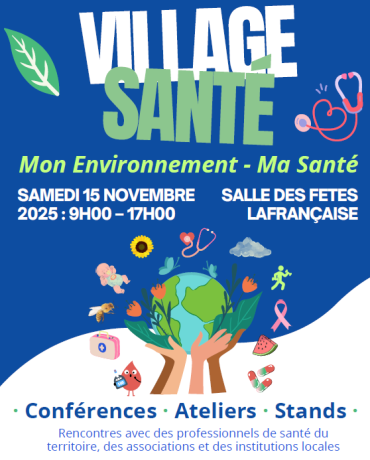 Mots clésLe Village Santé, pour sa 2ème édition, invite tous les habitants de Lafrançaise et ses alentours, des plus jeunes au plus grands, à rencontrer les professionnels de santé du territoire sur un forum et une journée dédiée. Le thème central sera Mon Environnement - Ma santé.