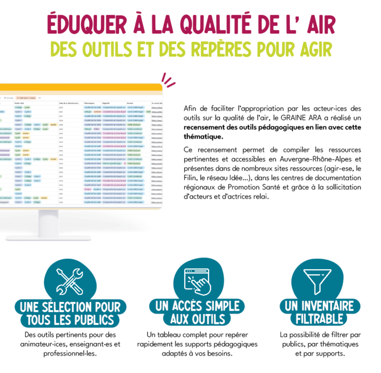 Mots clésDans le cadre du projet Génération air pur, porté par le GRAINE et Promotion Santé ARA, découvrez le document: « Inventaire des outils sur la qualité de l'air et panorama des compétences des éducateur·ices ».