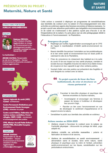 - Ateliers de sensibilisation en santé environnement : alimentation saine et durable, liens entre nature, santé physique et psychique pour la mère et l'enfant, prévention santé-environnement sur les tiques, sensibilisation sur les perturbateurs endocriniens.